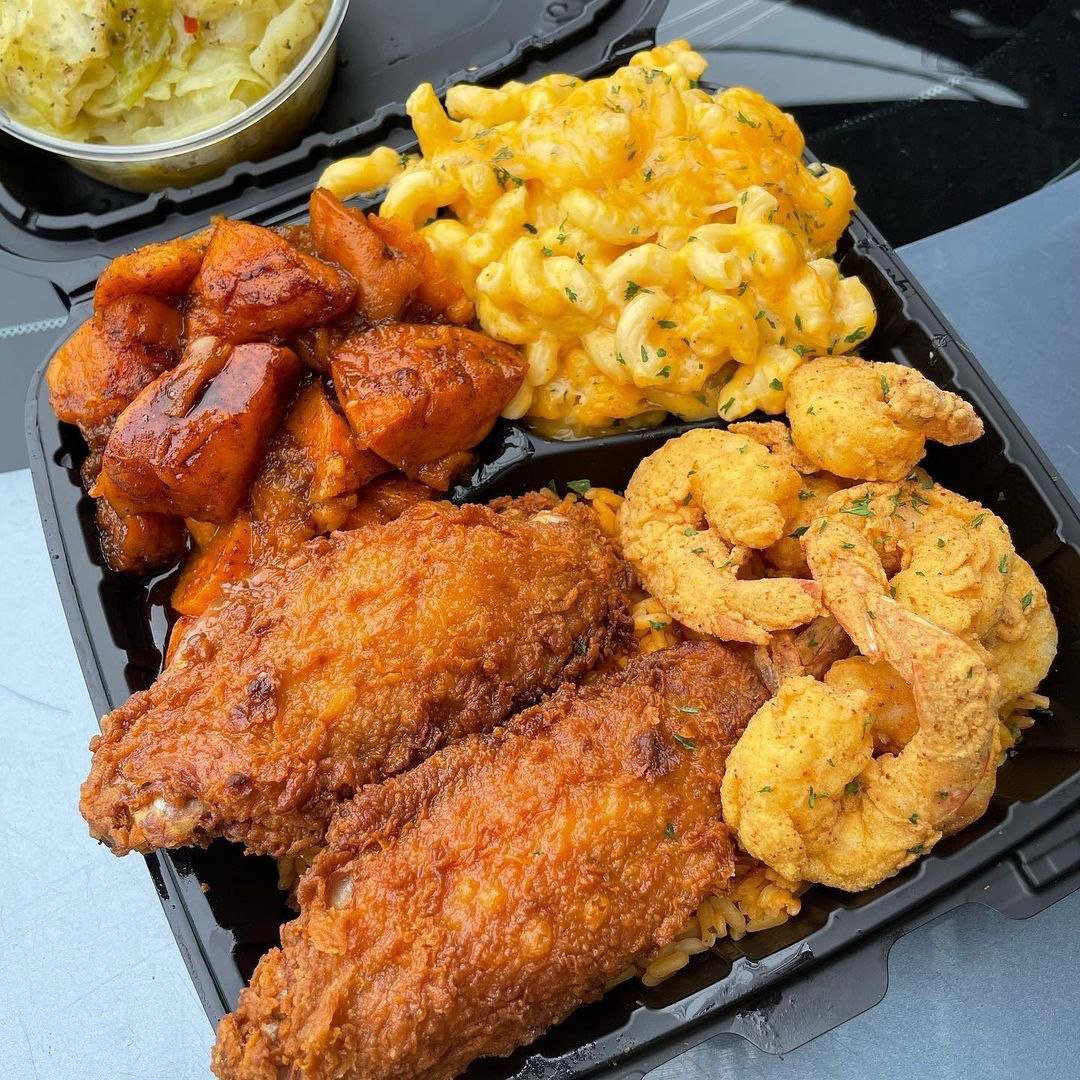 Crispy golden fried chicken paired with creamy, baked mac & cheese, seasoned shrimp, and sweet glazed yams, a true Southern comfort plate packed with bold flavor and generous portions. Perfectly balanced, freshly prepared, and made to satisfy every craving.